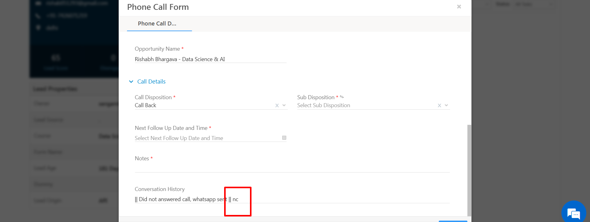 || Did not answered call, whatsapp sent||nc